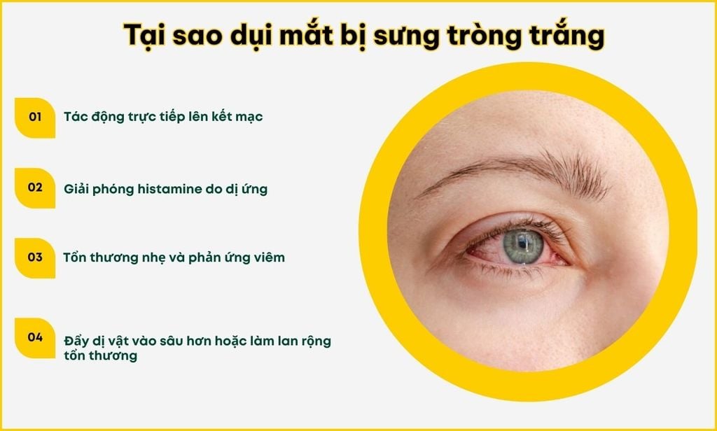 Dụi mắy sưng tròng trắng là lớp màng mỏng bao phủ lòng trắng mắt và mặt trong mí bị sưng phồng lên. Khi dụi mắt do tác động quá mạnh, lực ma sát sẽ kích ứng hoặc làm tổn thương kết mạc khiến mạch máu giãn nở và dịch thoát ra mô xung quanh, gây sưng tấy rõ. Sau đây là một số nguyên nhân thường gặp khiến tròng trắng bị sưng khi dụi mắt: