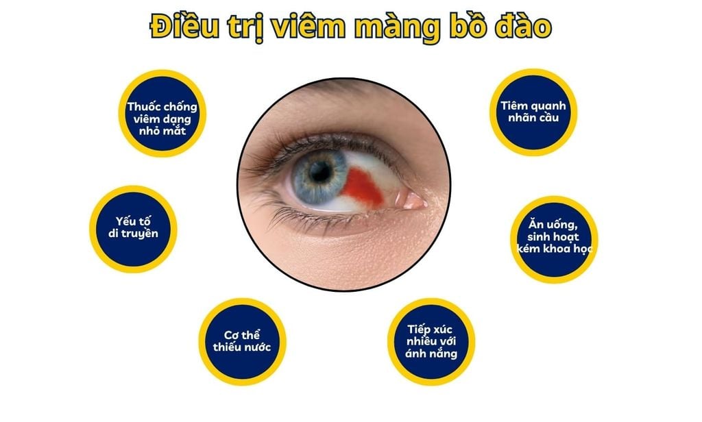 Điều trị viêm màng bồ đào với hai mục tiêu chính là kiểm soát phản ứng viêm, giảm triệu chứng và tìm, xử lý nguyên nhân nền nếu có. Tuỳ thể bệnh và mức độ nặng bác sĩ có thể chỉ định thuốc chống viêm dạng nhỏ mắt, uống hoặc tiêm quanh nhãn cầu, phối hợp thuốc giãn đồng tử để tránh dính mống mắt và giảm đau.