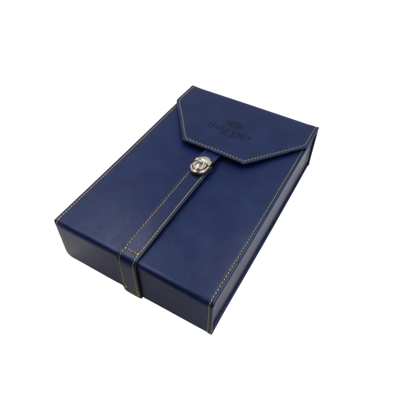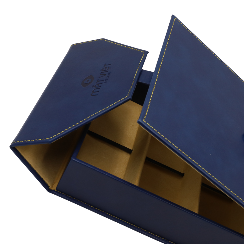 Về HỘP ĐỰNG KÍNH MẮT VIỆT HK4 B1050 ấn tượng với màu Xanh Navy lịch lãm của lớp vỏ ngoài, được chế tác từ da cao cấp, không chỉ mang lại cảm giác sang trọng khi chạm vào mà còn có khả năng chống bám bẩn và chống thấm nước. Điểm nhấn hoàn hảo nằm ở những đường chỉ may thủ công tương phản, chạy dọc theo thân hộp, làm nổi bật sự tỉ mỉ và đẳng cấp trong từng chi tiết.